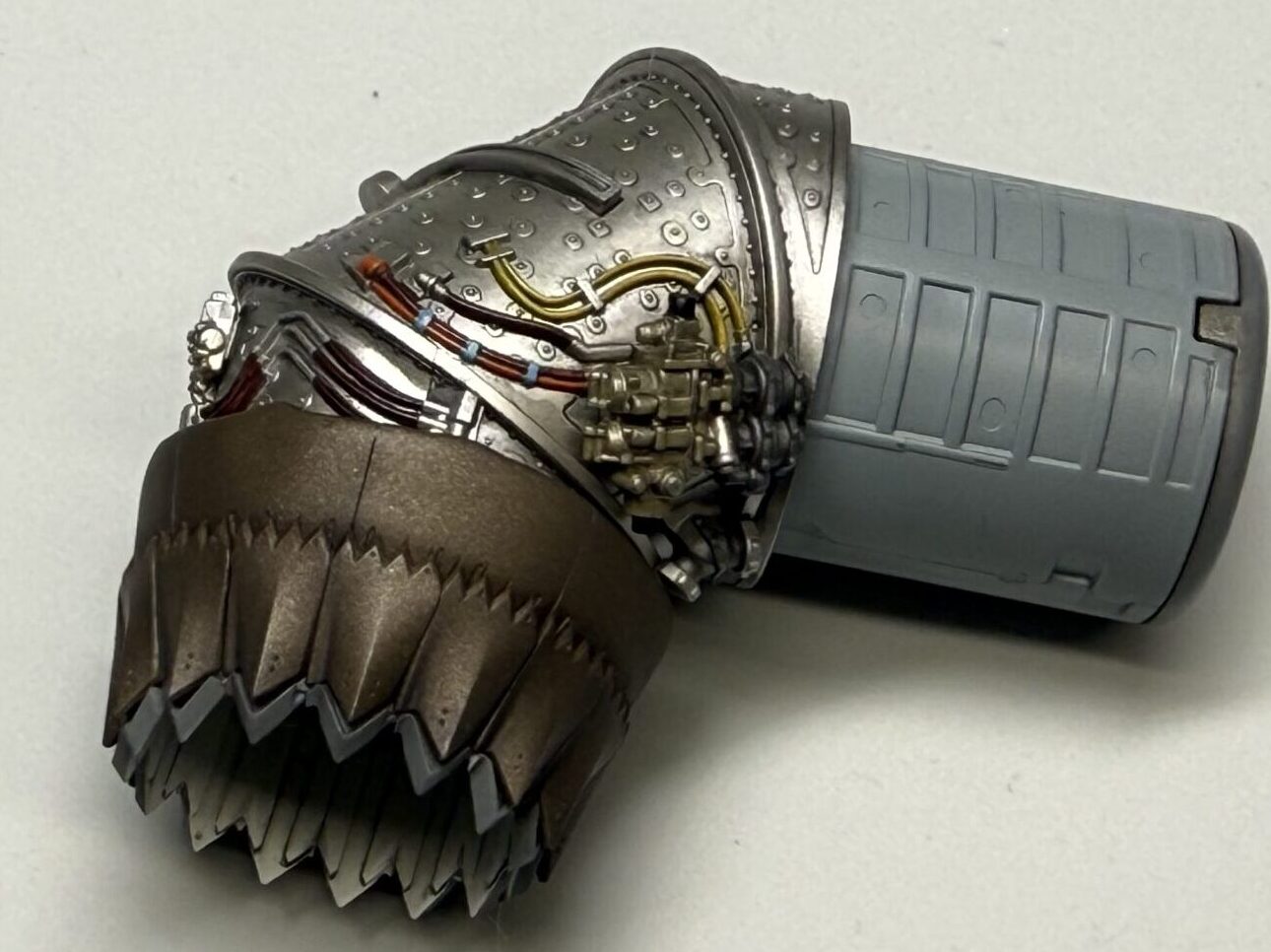 ベース色をほんの少し明るく調色して再現してみました。写真ではうまくお伝え出来ませんが、光の当たり方で明度が違って見える感じに仕上がっております。背中のギザギザと、補助インテーク右側(インテーク付近)のギザギザは同じ色で塗装してあります。