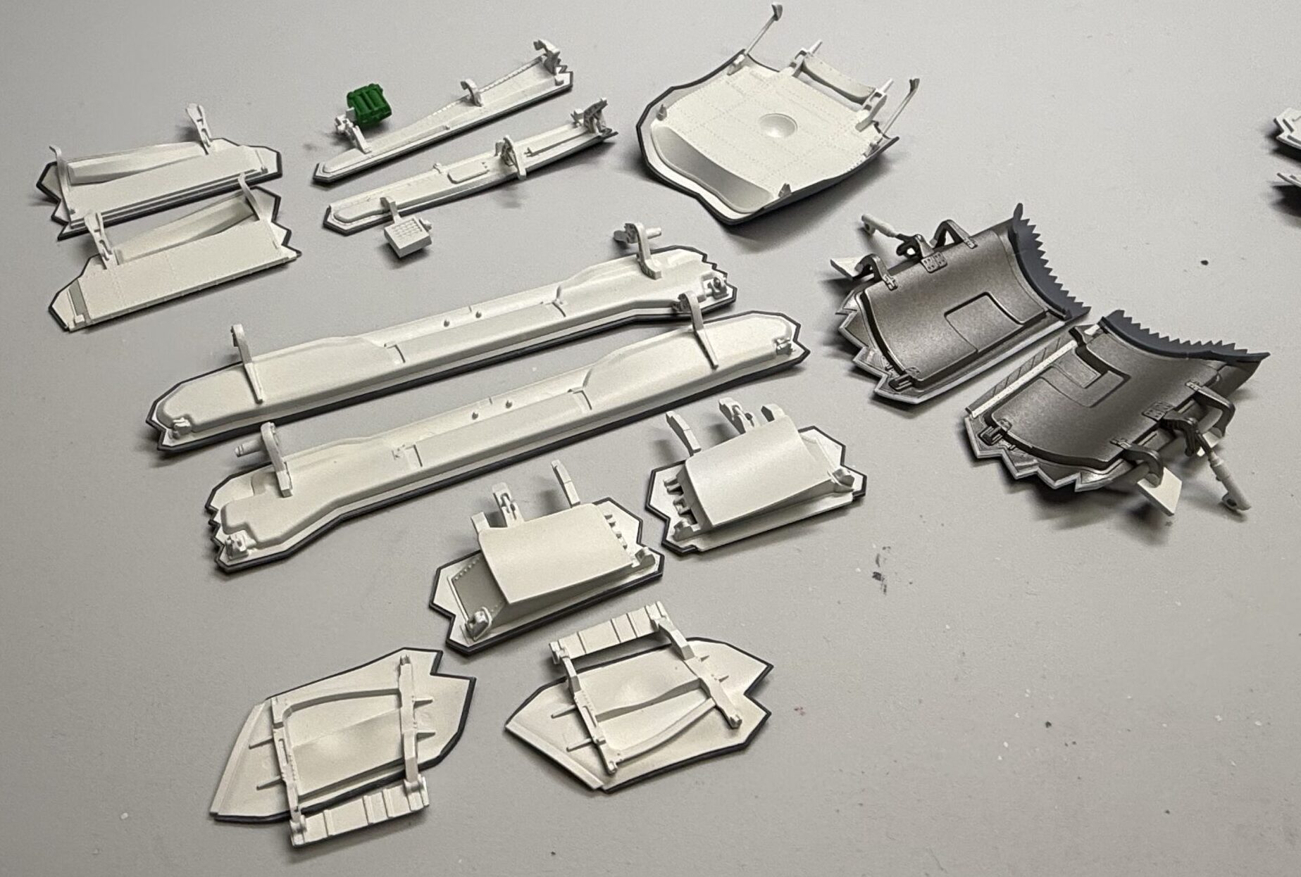 まずは使用するパーツを全て切り出して整形し、白く塗装する部分をまとめて塗ってしまいます。白はクレオスの316番ホワイトを使用しています。白は機体内部だけなのですが、かなりのボリュームです。