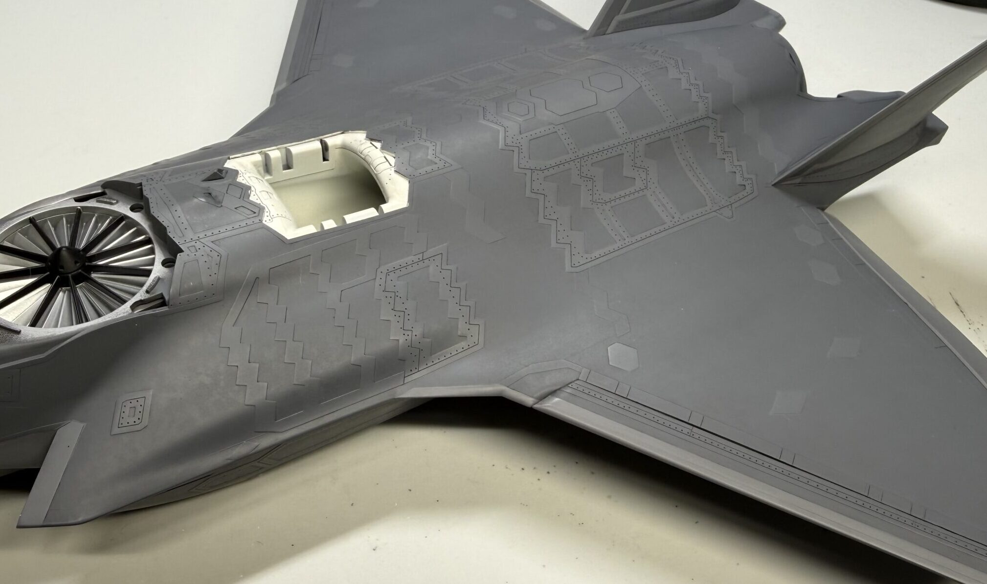 次に同じ色で汚し表現を追加します。F-18などと違い、まだまだきれいなイメージが強い機体なので、塗料の希釈率高めで、「言われて見れば」程度の控えめな表現に留めます。