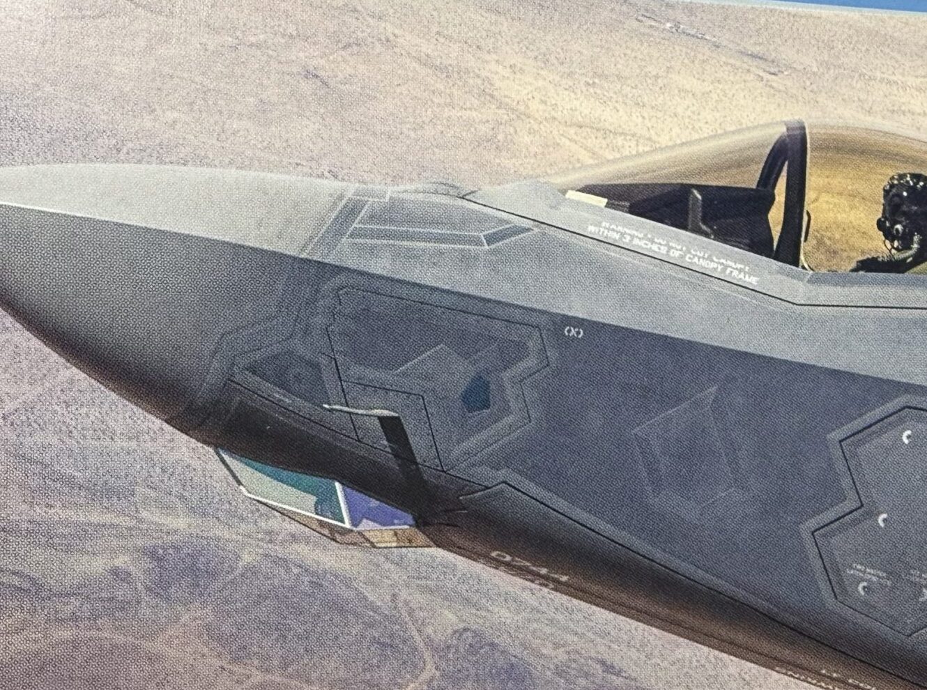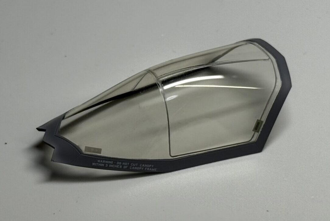 キャノピーの破砕コードもデカールで再現されていますが、これがまあまあムズイです。内側の凸モールドの上に貼っていくので、マークセッターで馴染ませなくてはシルバリングしてしまいます。クリアーコートは面相筆でデカール部分のみに施します。