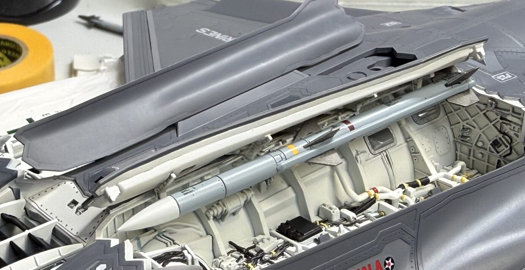 続いてウェポンベイです。今回は飛行状態のため、ほとんど見えなくなってしまいますが、本機体の目玉部分なので手抜きをせずに仕上げてみます。配線類は一体モールドで再現されています。塗り分けは大変ですが、追加工作無しでこの仕上がりは反則です。(;^ω^)